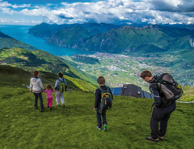 Über die steilen Felsvorsprünge aus Kalkstein hinauf, hoch oben über den Weingärten des Sarca-Tales führt die Tour in die jahrhundertealten Kastanienhaine zwischen Braila und Carobbi. Weiter geht es über die Weiden der Vallestrè-Alm bis auf den, mit Latschenkiefern bewachsenen Bergrücken des Monte Stivo, von dem aus man einen unvergesslichen 360°-Blick über die Dolomiten, die Adamello-Presanella-Gruppe und den spiegelnden Gardasee bis zur Poebene genießen kann.