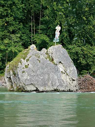 Nachdem das Isartal nach Süden abgebogen ist, sieht man in der Mitte des Flusses eine Insel mit Treibholzanschwemmungen. Sie ist besonders geschützt, da sie die Kinderstube von bodenbrütenden Vögeln wie Uferläufer, Regenpfeifer und Flussseeschwalbe ist. Bald danach erblickt man einen etwa 5 m hohen Felsen inmitten der Isar, den Georgenstein, mit der Statue des heiligen Georg darauf. An diesem Felsen mit seinen Stromschnellen kenterten früher öfters die schwer beladenen Flöße. Und so wird erzählt, dass ein gekenterter Flößer seinen Namenspatron um Hilfe anrief und gerettet wurde. Daraufhin ließ er ein Heiligenbild auf dem Felsen anbringen. Seit 1993 steht eine bemalte Blechfigur des Heiligen auf dem Felsen. Durch bauliche Maßnahmen ist diese Situation heute entschärft, sodass die Hauptströmung westlich am Georgenstein vorbeiführt. Der Felsen selbst besteht aus verbackenen Deckenschottern (Nagelfluh) und ist vom östlichen Isarhang abgerissen und auf den darunter lagernden tonig-mergligen Tertiärschichten ins Isarbett abgerutscht.