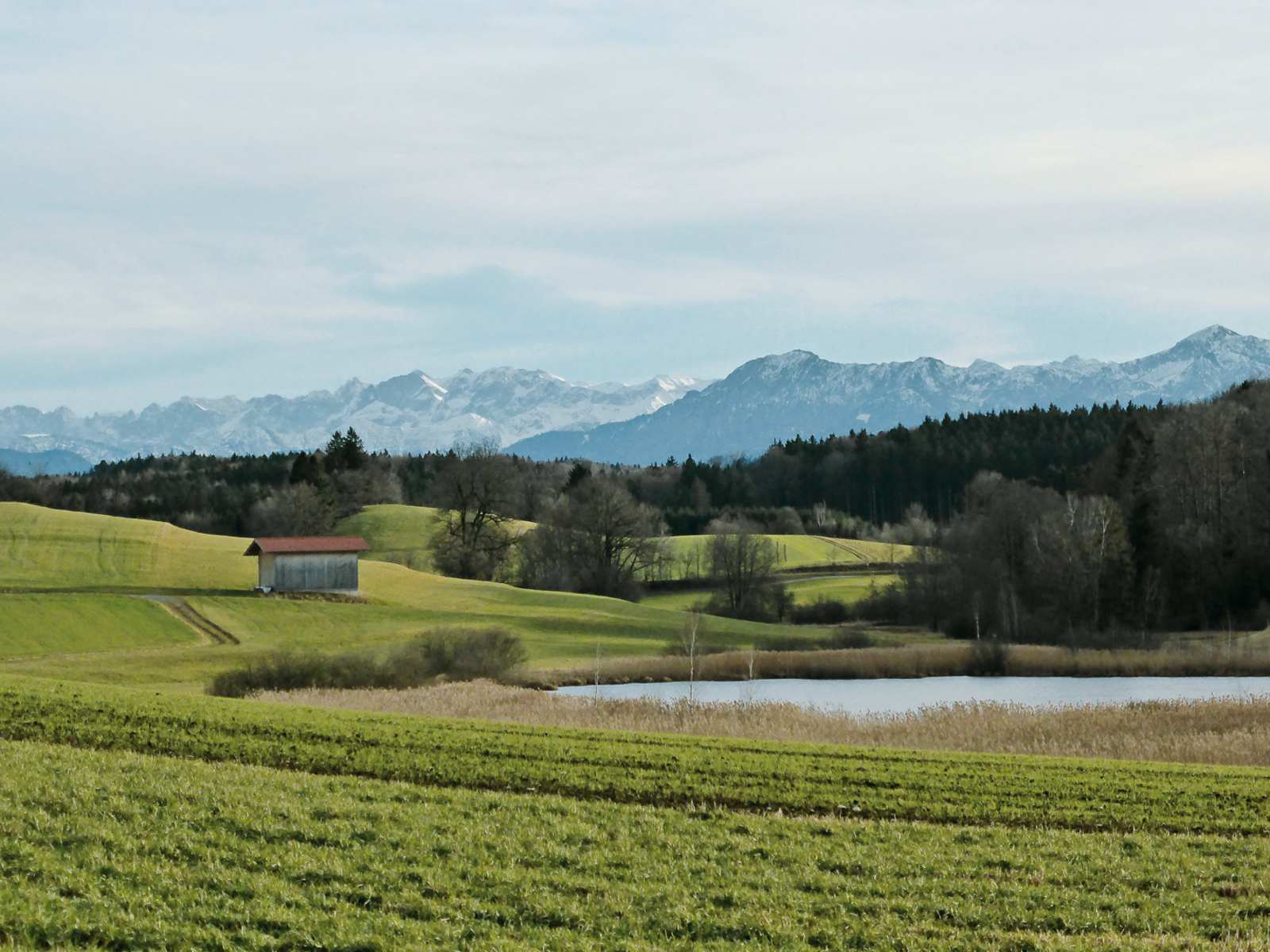Bei schönem Wetter genießt man auf dem Weg Richtung Süden den Blick über die Moore, Wiesen und Wälder bis zu den Alpen. Eine Bank neben einem Bildstöckl und einem Findling lädt zum „Ausruhen – Nachdenken“ ein. Noch bevor man auf eine beschilderte Wegkreuzung stößt, an der man sich rechts hält, liegt vor den Wanderern der Hohenberger Hügel (670 m), ein alleinstehender Drumlin. Kurz vor Magnetsried folgt man dem Hinweisschild Ungertsried. Weiter geht es vorbei an einem Bauernhof in nordwestliche Richtung. An der nächsten Kreuzung hält man sich rechts. Hier lohnt es sich nochmals, den Blick in den Süden über den Beatweiher und die hügelige Landschaft bis zu den Bergen gleiten zu lassen. Nach ca. 500 m geht der Fahrweg nach links in einen Wiesenpfad über, der durch das degradierte Hochmoor bei Farchenbichl mit randlichen Streu- und Nasswiesen führt, in dem noch der ehemalige Torfabbau zu erkennen ist.