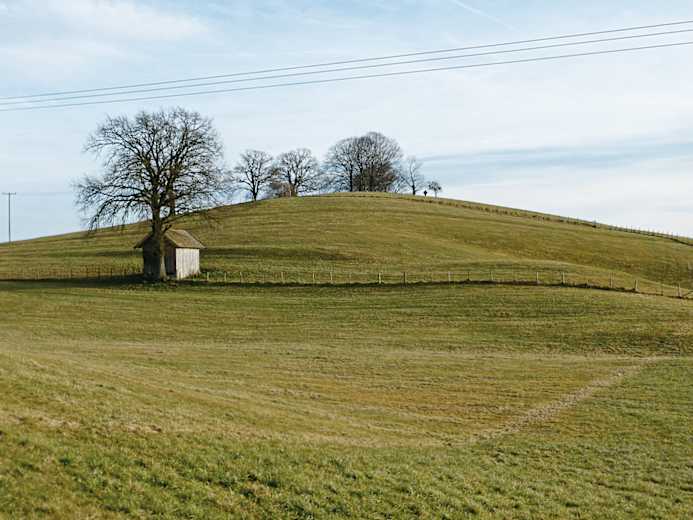 Ist man am Hinweisschild Hardtwiese angelangt, folgt man ihm. Weiter geht’s auf dem kiesigen Weg durch diese einzigartige Landschaft, bis man auf eine geteerte Straße stößt, die nach rechts zur Hardtkapelle führt, an der man auch eine Pause einlegen kann. Eine Legende besagt, dass der Bau dieser Wallfahrtskapelle Maria Hilf auf einen Streit über die Weiderechte zwischen den Gemeinden Weilheim und Haunshofen im 13. Jahrhundert zurückzuführen ist. Bei der Kapelle endet auch ein von Bauerbach kommender Kreuzweg mit 14 aus Tuffstein gefertigten Stationen.