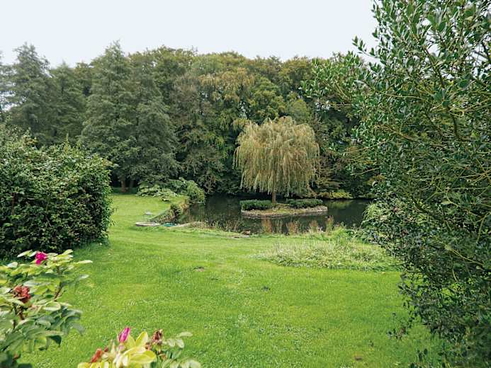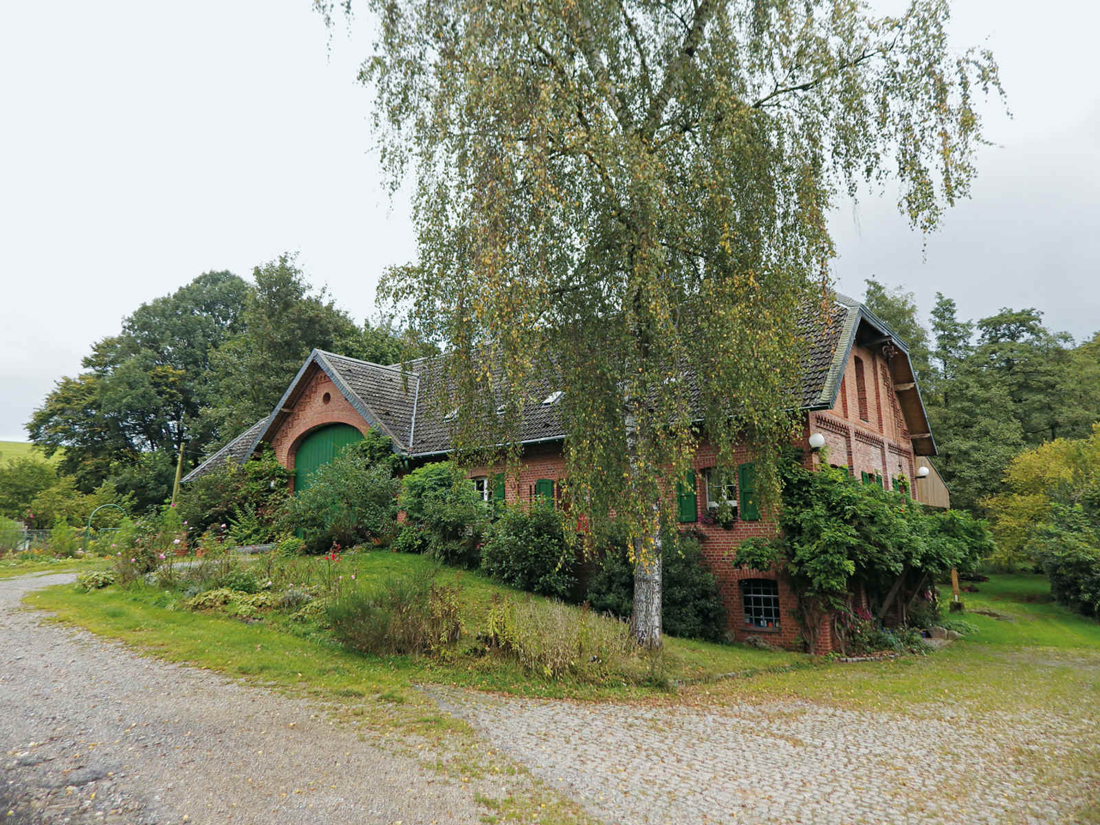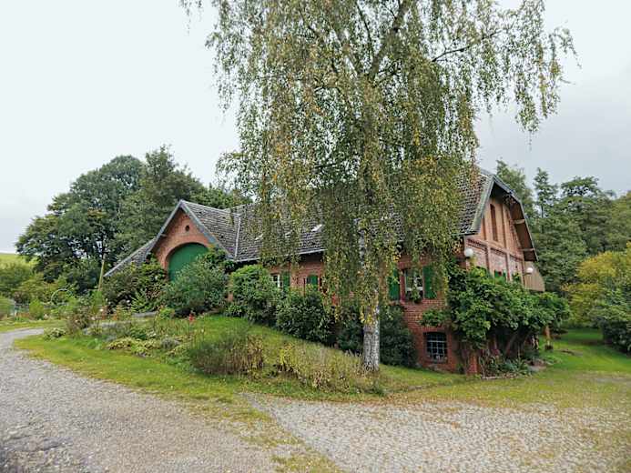 An einem weiteren Gut trifft man auf eine Teerstraße. Auf dieser geht man nach links, an dem Gehöft vorbei, und biegt dann nach ein paar Metern nach rechts auf einen Feldweg ab. Auf diesem trifft man nach einiger Zeit auf ein schönes Landgut mit einer kleinen Parkanlage und Teichen. Direkt vor dem ersten Haus biegt man an der Stelle, wo die Pflasterung beginnt, scharf nach rechts auf einen Weg ab (leicht zu übersehen!).