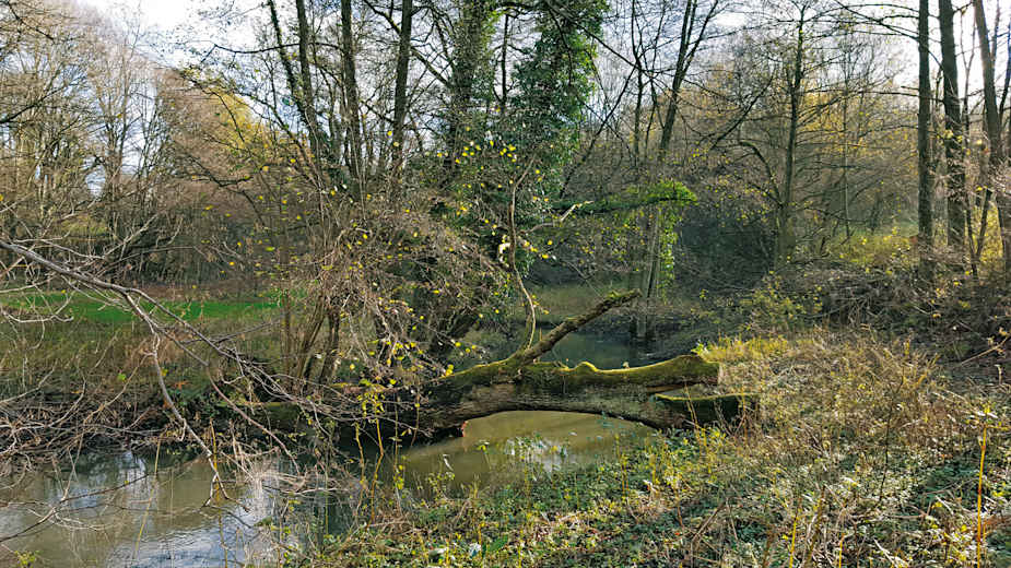 An der kommenden kleinen Kreuzung folgt man dem Weg nach rechts, der eben verläuft und stückweise geteert ist. Vor einem Haus führt der Weg nach links als Pfad bis zur Düssel hinab und geht an einigen Weihern entlang. Auf einer kleinen Brücke überquert man die Düssel und folgt weiter ihrem idyllischen Tal.