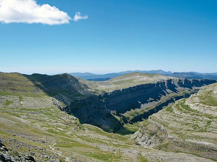 Man steigt nach rechts in den Barranco Fuen Blanca ab. Im Frühjahr und Frühsommer blickt man hier auf einen wunderschönen Wasserfall, der im Sommer allerdings oft trocken ist. Nachdem man über einige Serpentinen steil in die Schlucht abgestiegen und an der Quelle Fuen Blanca, 1.704 m, vorbeigegangen ist, erreicht man das Ende des Cañón de Añisclo (arag. Balliñisclo), des längsten Taleinschnitts des Nationalparks. Man überquert den Río Bellós, 1.660 m, über eine Planke und steigt auf der anderen Seite über grasbewachsene Terrassen wieder aus dem Tal hinaus. Am Collado de Añisclo, 2.453 m, treffen sich beide Varianten des GR 11 wieder. Nun liegt einer der anstrengendsten Abstiege des GR 11 vor den Wanderern: Auf rund 4 km Strecke geht es 1.200 Hm in die Tiefe. So erreicht man den Talgrund des Valle de Pineta mit dem Refugio de Pineta, 1.240 m, jenseits des meist trockenen Flussbetts. Nach Nordwesten hin weitet sich das Tal zu einem imposanten Felskessel.