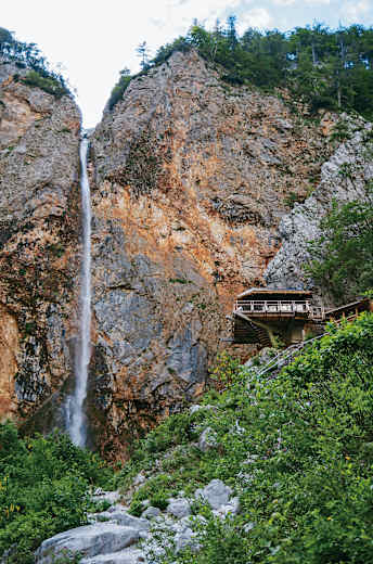 Am oberen Ende des Trogtales entspringt die Savinja, die sich gleich wenige Hundert Meter vom Ursprung entfernt als imposanter Wasserfall in Szene setzt. Nach der Quelle findet man sich bald bei der netten Frischaufhütte wieder, wo der Aufstieg durch das weite Okrešelj-Kar beginnt. Im Abstieg vom höchsten Punkt der Etappe an der Südspitze Österreichs kommt man nochmals in den Genuss einer aussichtsreichen Berghüttenterrasse, bevor es hinunter nach Jezersko am Ufer der Kokra geht.
