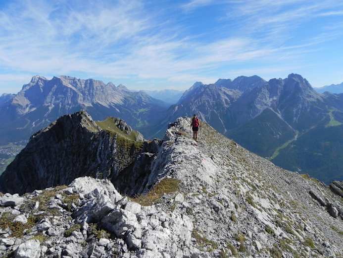 Nun folgt der Weiterweg zur Gartner Wand. Man geht direkt über den Gipfelgrat bis zum Ostgipfel. Dabei wandelt man ständig über dem Abgrund, bricht der Grat doch fast senkrecht in Steile Felsflanken ab. Vom Ostgipfel ist es nicht mehr weit bis zum Hauptgipfel auf der Gartner Wand.