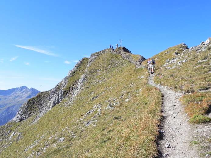 Von der Hütte folgt man dem Steig direkt hinauf zum Grubigsteinhaus. Von hier zieht ein guter Steig aufwärts zum Kreuz auf dem Grubigstein, von dem man eine prächtige Aussicht erhält.