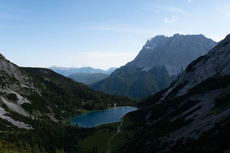 Man überwindet die Felsstufe und gelangt in flacheres Wald- und Wiesengelände. Auf einer Schotterstraße geht man weiter bis zum Seebensee. Auf der linken Seeseite geht man bis zur Talstation der Materialseilbahn der Coburger Hütte.