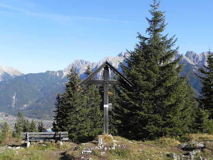 Hier geht man nach rechts und steigt entlang der Grenze bergauf zum Grünkopf mit Kreuz und Bank. Dieser bietet eine überraschend schöne Aussicht.