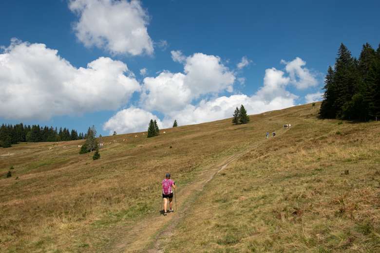 Man wandert an den Gebäuden vorbei in Richtung Herzogenhorn. An der Glockenführe verzweigt sich der Weg. Man geht geradeaus weiter und folgt dem Weg hinauf bis zum Gipfel des Herzogenhorns. Hier oben genießt man eine wunderbare Aussicht auf die Umgebung.