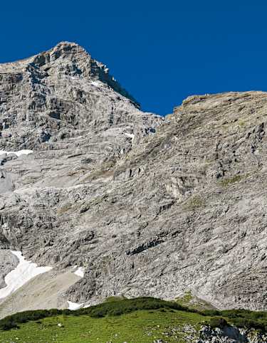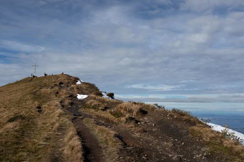 Über weite Wiesen steigt man hinauf zum Gipfelkreuz auf dem Hohen Freschen. Die Nord- und Westseite stürzt über Felsen steil ins Tal ab. Vom Gipfel selbst hat man eine großartige Aussicht auf das Rheintal und bei schönem Wetter bis zum Bodensee.
