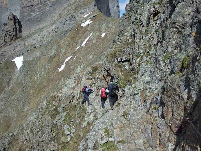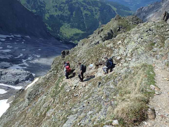 Man biegt dann rechts ab und folgt dem schmal weiss-blau markierten Alpinpfad südwärts zum aufälligen Moränenkamm und über diesen zu einer brüchigen Steinstufe. Eisenstifte, Drahtseile und Leitern helfen hinauf auf eine Gröllterasse. Die Passage kann bei Nässe etwas heikel sein.