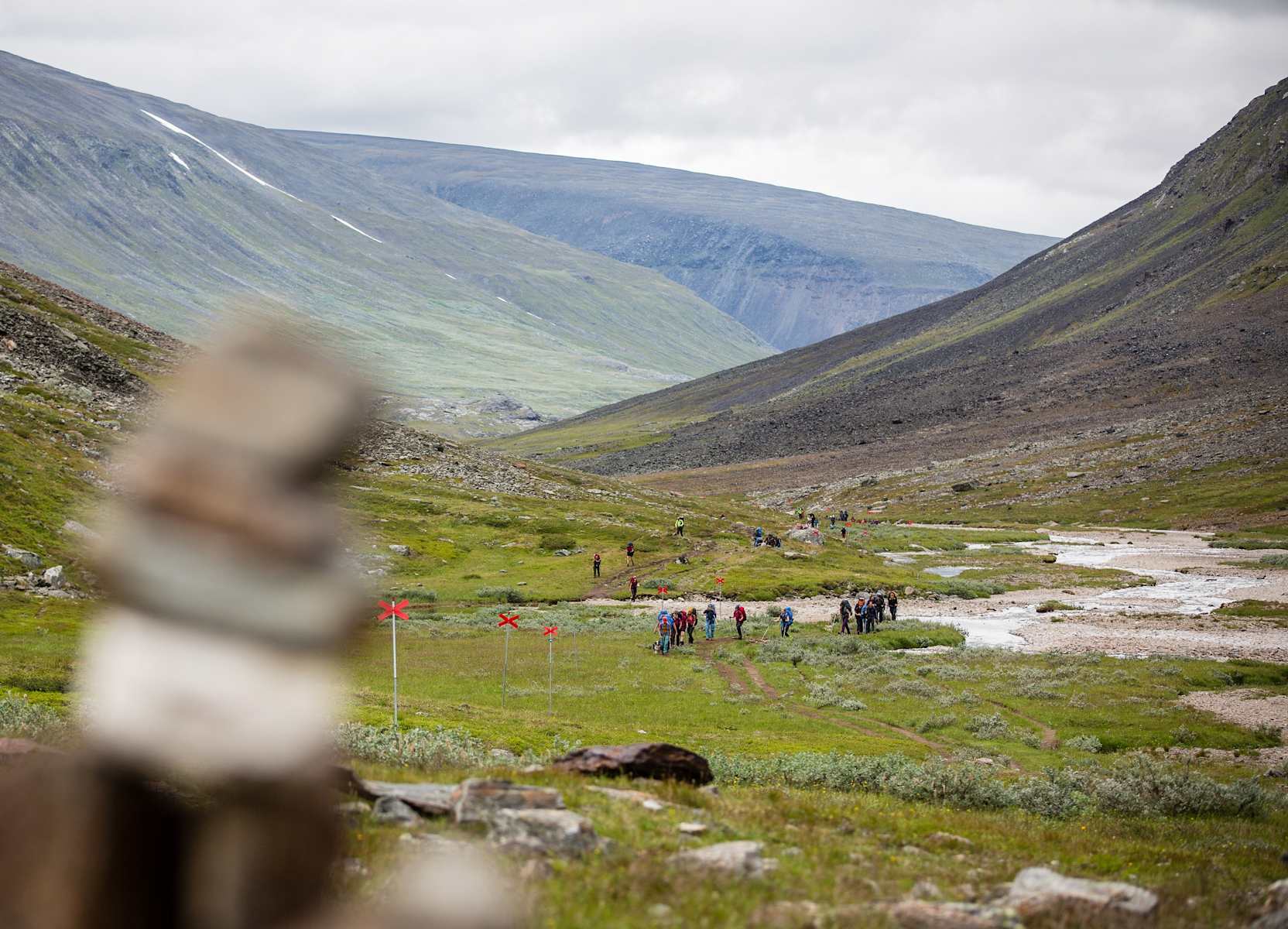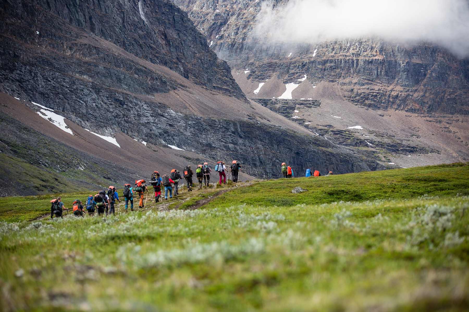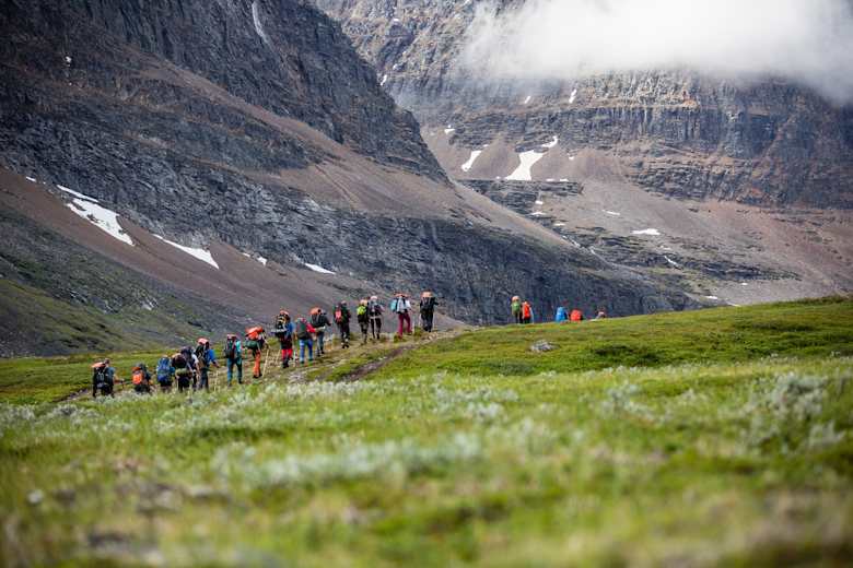 Auf der zweiten Etappe der Mehrtagestour umrundet man die beeindruckende Bergkulisse des Kebnekaise bis nach Sälka. Dabei gilt es in der schwedischen Tundra einige Hindernisse zu überwinden: zahlreiche Flüsse und Bäche müssen oft bei hohem Wasserstand gequert werden.