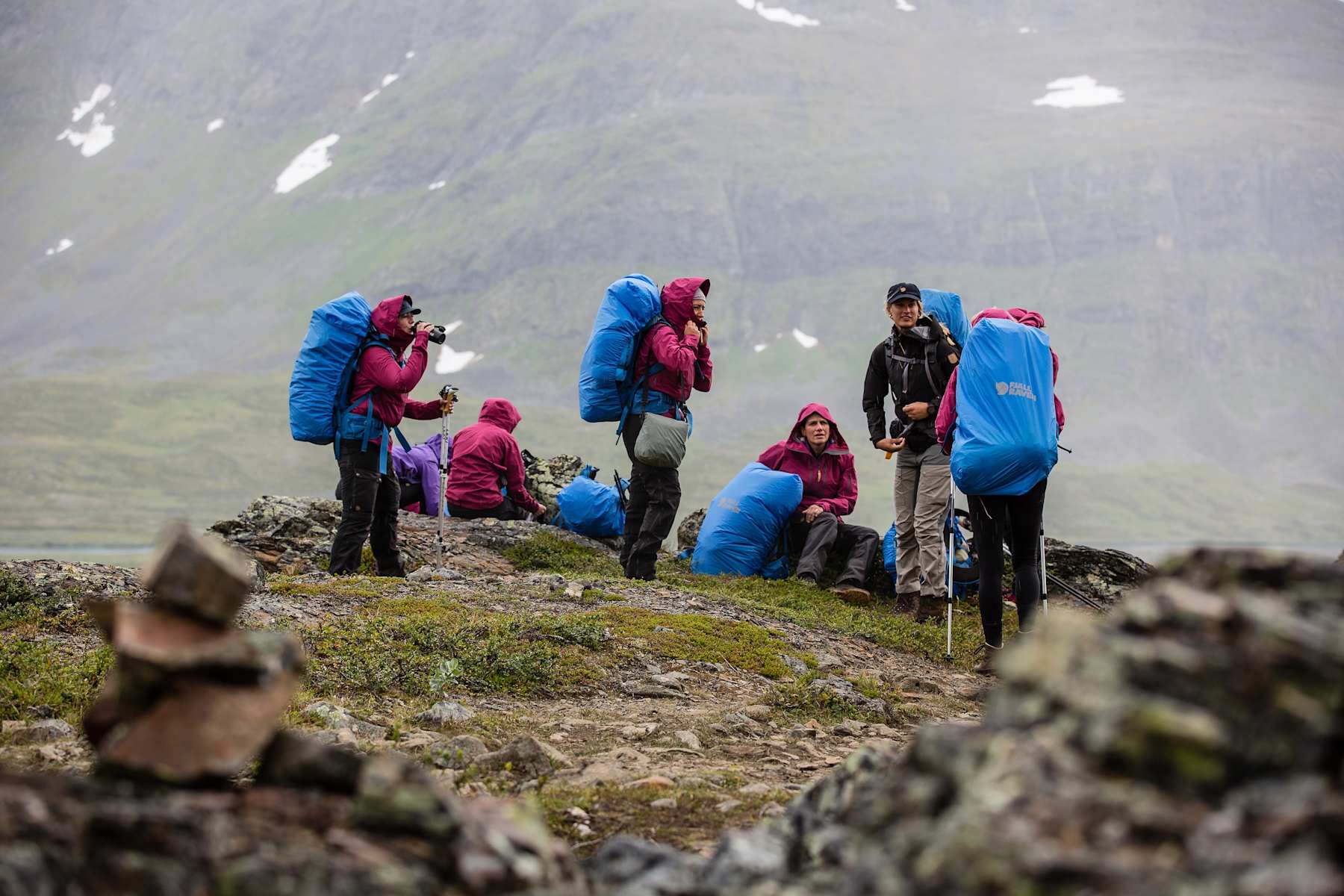 Wohlverdiente Pause auf der kleinen Anhöhe vor der Singitjåkko Ebene Foto: Fjällräven - Anette Andersson