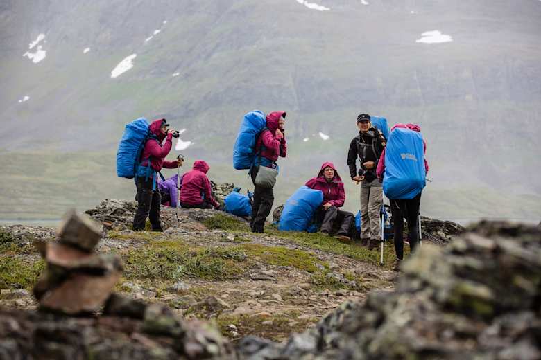 Wohlverdiente Pause auf der kleinen Anhöhe vor der Singitjåkko EbeneFoto: Fjällräven - Anette Andersson