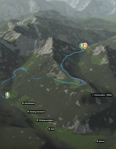 Man verlässt den Ort Richtung Osten und folgt dem E4 Voralpenweg unter der Bundesstrasse hindurch in Richtung Ellmaustein (1.047 m), Steinbach-Siedlung. In einer scharfen Linkskurve, kurz hinter der Brücke über den Ellmaubach, verlässt man die Strasse und folgt dem Wanderweg in den Wald Richtung Rummingmühle.