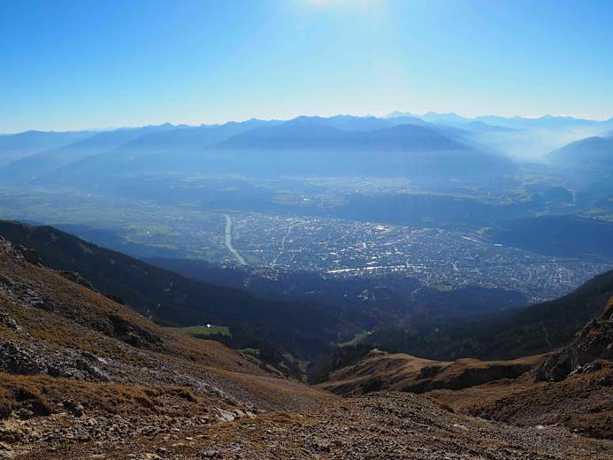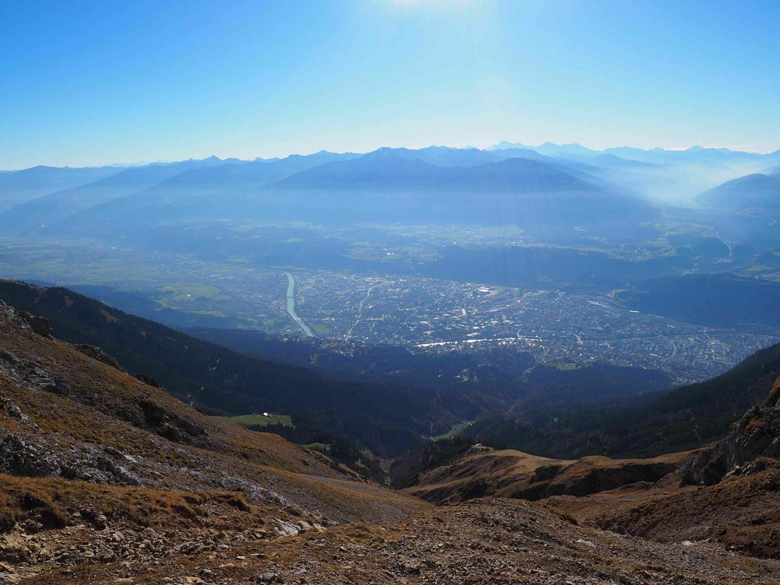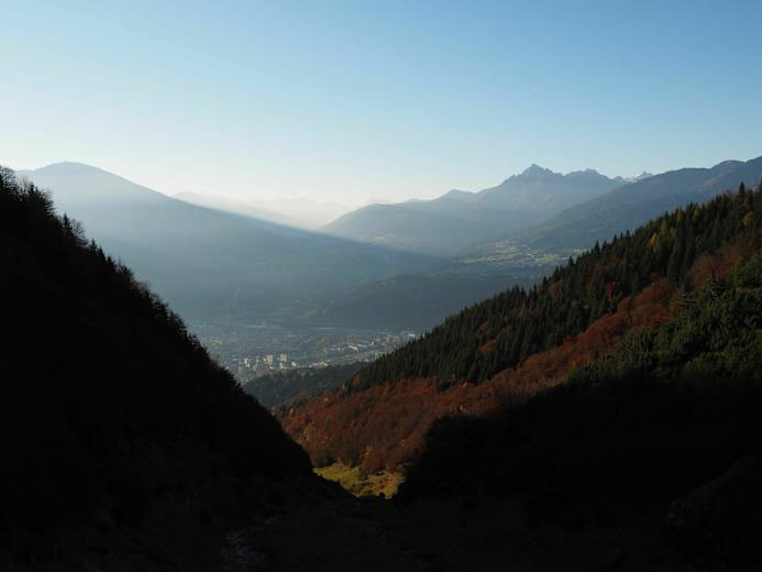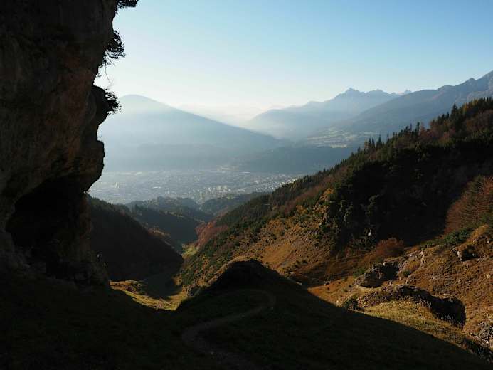 Anstieg durch den Höttinger Graben mit schöner Sicht auf Innsbruck und ins Wipptal Foto: Riki Daurer