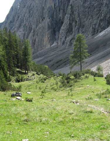 Ein recht steiler Waldsteig führt aufwärts. Bald erreicht man den waldfreien Höttinger Graben. Jedes Jahr - speziell im Frühjahr - rauschen hier die Nassschneelawinen durch und außer einigen niedrigen Erlensträuchern kann sich direkt im Graben kaum eine höhere Vegetation halten.