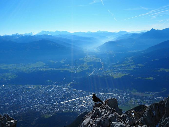 Weiter Blick ins Wipptal mit den Stubaier und Tuxer Alpen, den aus die Alpendohlen genießen. Foto: Riki Daurer Bildergalerie (8)