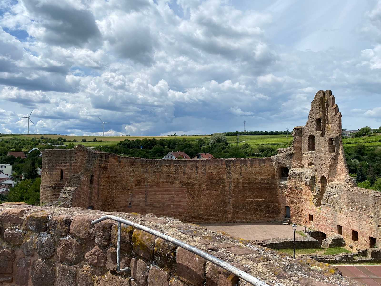 Durch sonnige Weinberge erreichen wir schließlich das kleine Dorf Battenberg. Lohnenswert ist ein Abstecher zur Burgruine Battenberg, welche einen Weitblick in die Rheinebene bietet, oder der Stichweg zu den „Blitzröhren“, einer geologischen Besonderheit.
