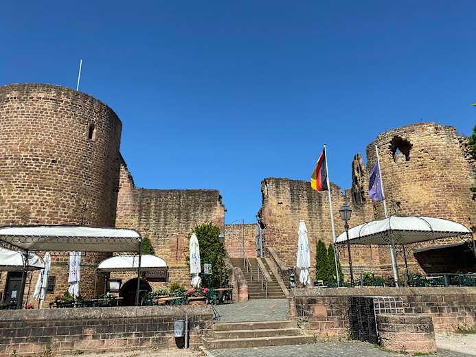 Der Fernwanderweg beginnt zwischen den historischen Gemäuern der Burgruine Neuleiningen und der Pfarrkirche St. Nikolaus. Über gepflasterte, von hübschen Fachwerkhäusern gesäumte Gassen und Treppen verlassen wir den Ort und wandern hinab nach Neuleiningen‑Tal.