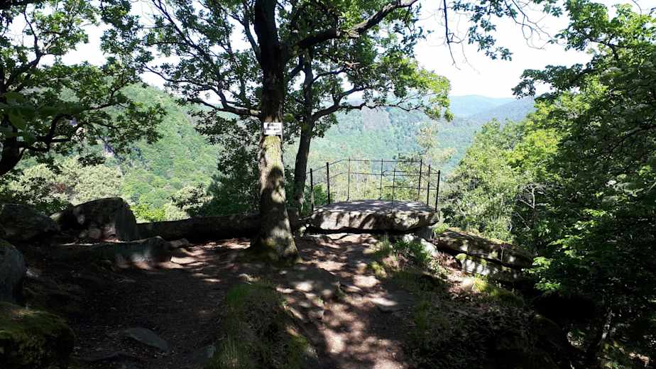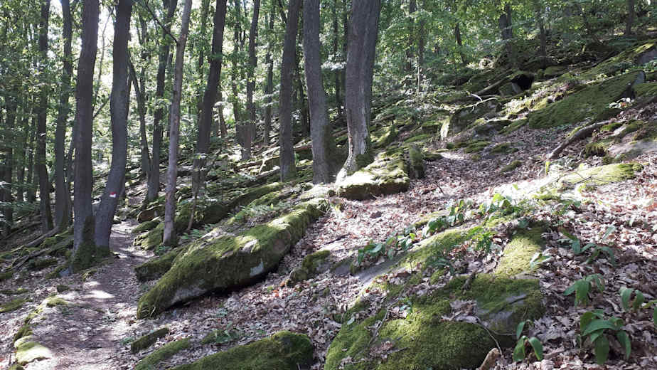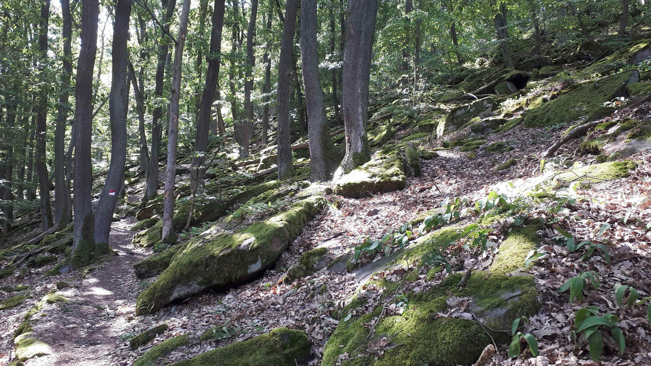 Gestärkt geht es im Auf und Ab weiter zur Kalmit. Auf dem höchsten Gipfel des Pfälzerwaldes erwartet uns nicht nur eine fantastische Aussicht auf die mehr als 500 m tiefer gelegene Rheinebene, sondern auch die an Wochenenden und mittwochs bewirtschaftete Ludwigshafener Hütte (PWV). Südwestlich der Kalmit auf dem Hüttenberg liegt das imposante Naturdenkmal Felsenmeer, ein landschaftliches Highlight dieser Etappe.