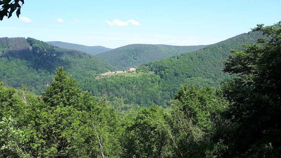 Auf schönen Pfaden wandern wir weiter zum Sühnekreuz und anschließend abwärts in Richtung Hambacher Schloss, das in jedem Fall einen Abstecher wert ist. Im Uhrzeigersinn umrunden wir den Sommerberg und gelangen schließlich zum Hohe‑Loog‑Haus (PWV), wo wir auf der Terrasse bei einer Brotzeit den herrlichen Ausblick über die südliche Pfalz hinweg bis zum Kraichgau und Schwarzwald genießen können.