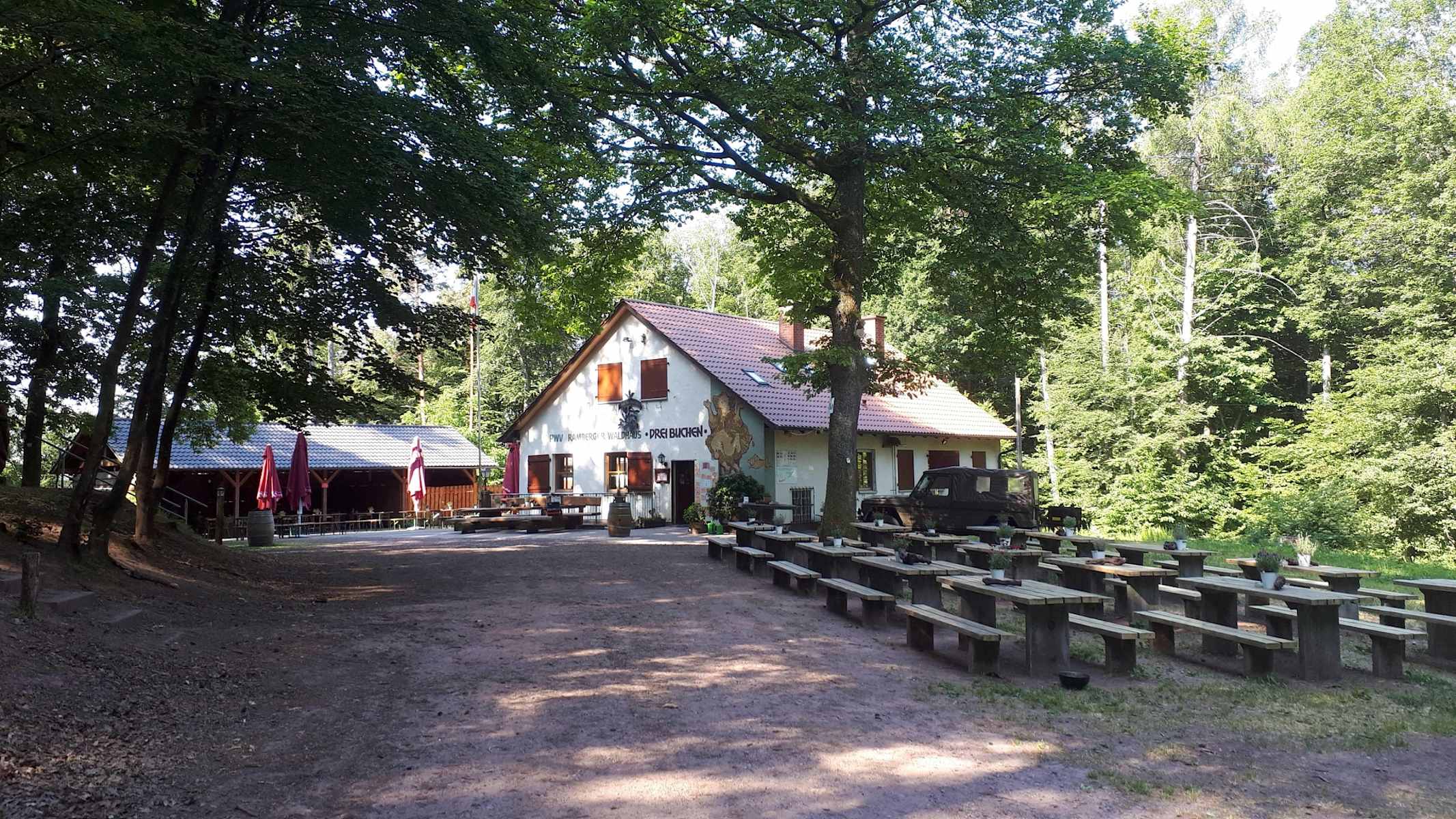 Von Burrweiler kehren wir auf dem vom Vortag bekannten Kreuzweg zunächst zur St. Anna-Hütte (PWV) zurück. Auf schattigen Wegen geht es nun an den Hängen des Teufelsbergs entlang zur Trifelsblick‑Hütte (PWV) in 550 m Höhe. Hier können wir auf der Terrasse das herrliche Panorama genießen, dem die Hütte ihren Namen verdankt. Der Blick reicht über die Burg Trifels hinweg weit in den Wasgau und zu den Vogesen.