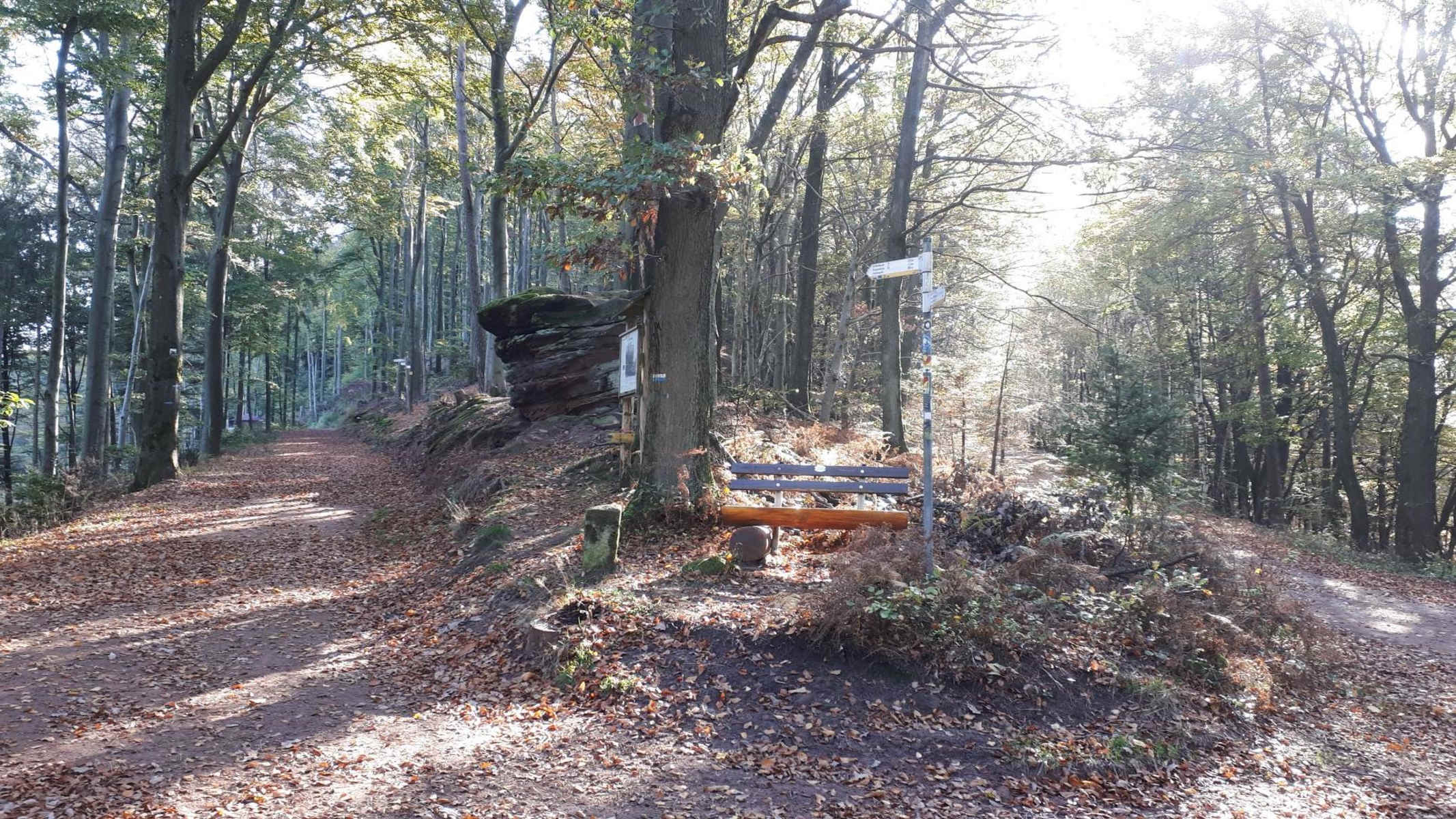 Auf dem mitunter steilen Anstieg in den Sattel zwischen Grüneck und Franzosenkopf löscht das klare, kalte Wasser des Eselstränke-Brunnens unseren Durst. Beim Abstieg hinab nach Gräfenhausen lädt der Rastplatz 3‑Burgen‑Blick zum Verweilen ein. Gegenüber erheben sich die Burg Trifels, die Ruine Anebos sowie die Ruine Scharfenberg in den Pfälzer Himmel.