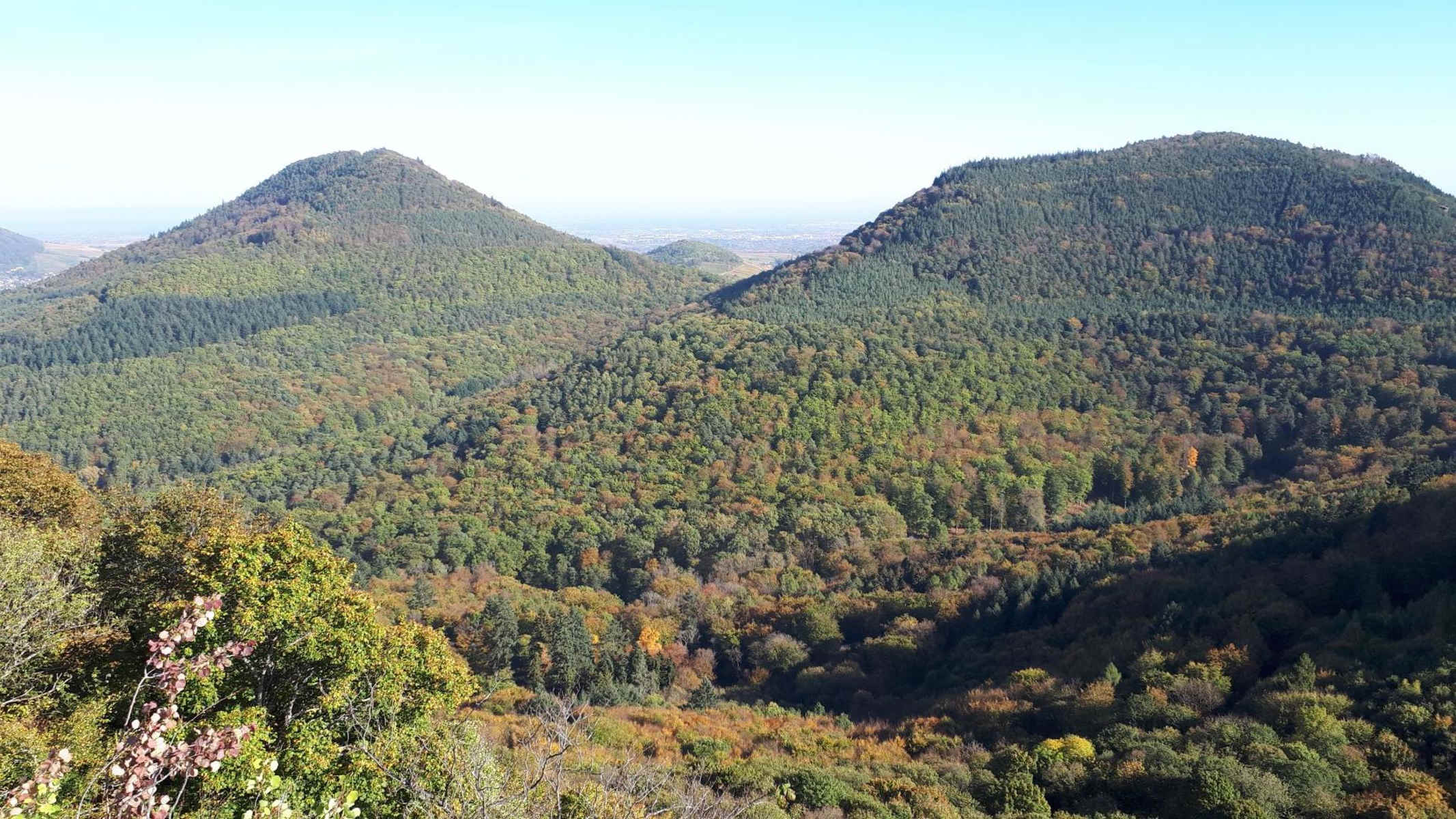 Auf einem reizvollen Pfad wandern wir unterhalb der Felsen und der Ruine Scharfenberg hinweg. Nach einem kurzen steilen Abstieg folgen wir den bewaldeten Südhängen des Föhrlenbergs und steigen anschließend durch Esskastanienwälder hinauf zur Ruine Neukastell. Dort bringt uns eine steile Leiter zu einer Aussichtsplattform mit herrlichem Blick zur gegenüberliegenden Madenburg.