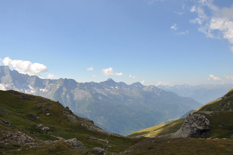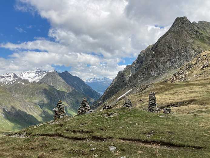 Hat man die Grathöhe erreicht, folgt man dem Blockgrat bis zum südlichsten Punkt mit Steinmann. Die endlose Aussicht reicht hier von den Oberengadiner Seen und das tief eingeschnittene Bergell zu den majestätischen Granitbergen gegenüber.