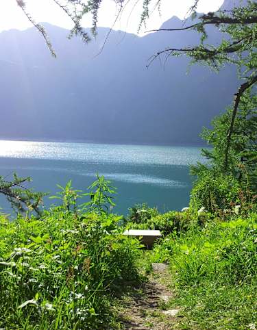 Durch zwei Buchten wandert man den See entlang, hier finden sich viele hübsche Plätzchen zum Spielen und rasten. Wenn man das Seeende schon sehen kann zweigt nach rechts ein Steig ab, der leicht ansteigend in den Lärchenwald führt.