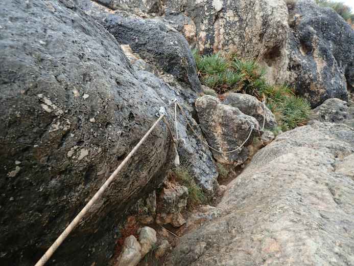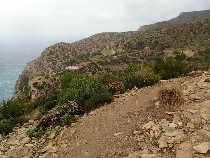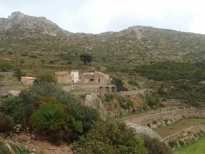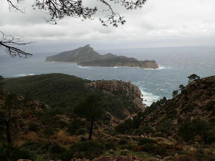 Hier kreuzt ein breiterer Weg, der GR221 führt aber geradeaus und nach etwa 150 m halb rechts bis zu zwei Betonpfählen. Dahinter nimmt man den nach links bergauf führenden Weg, er wird schmaler und bietet manch einen kleinen Blick auf die vorgelagerte Insel Sa Dragonera. Eine besonders schöne Aussicht hat man hinter einer seilversicherten Kletterstelle, hier schaut man hinab in das Hochtal mit der Ruine des Trappistenklosters La Trapa. Dort laden die Ruine der Klostermühle und eine Aussichtsplattform zu einem Abstecher ein, bevor es auf der Klosterzufahrt bergauf bis zu einer Haarnadelkurve geht.
