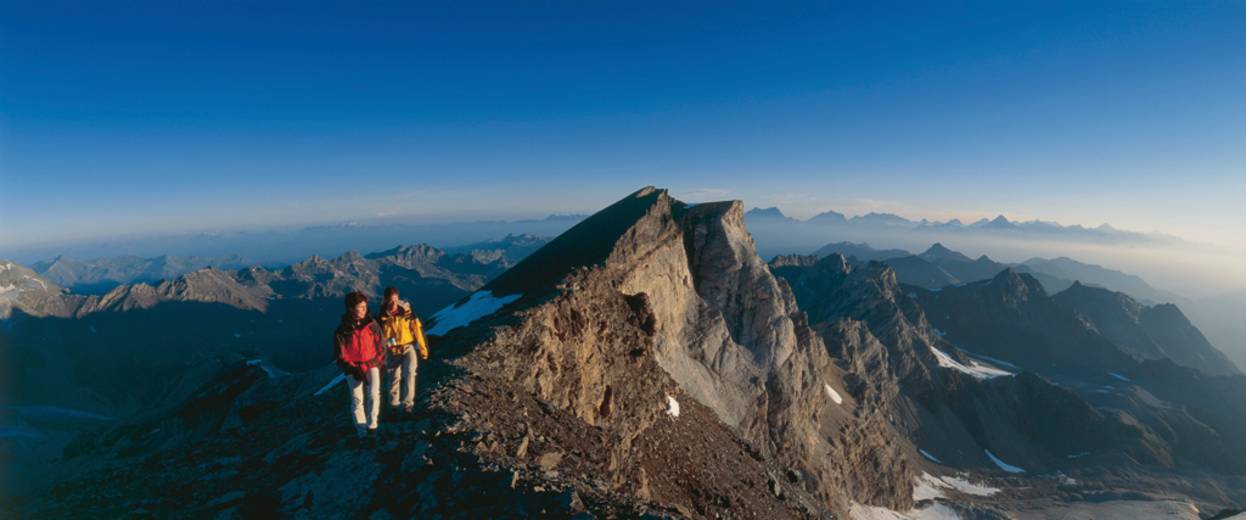Das Barrhorn (3.610 m) im Kanton Wallis gehört zu den höchsten Alpengipfeln, die sich ohne Hochalpinausrüstung als Wanderung bewältigen lassen. Noch dazu ist der Berg ein Aussichtsgipfel der Extraklasse: Das Panorama umfasst eine ganze Kaskade von Viertausendern, darunter die Mischabel-Kette und die Monte-Rosa-Kette der Walliser Alpen in der Schweiz.