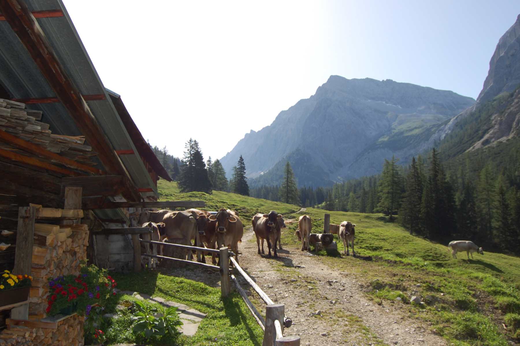Nach der Übernachtung auf dem Hallerangerhaus folgt man dem Weg 224 Richtung Westen. (Abstecher zur Sunntigerspitze: ab Hallerangeralm schwach markierter Steig Richtung Norden).