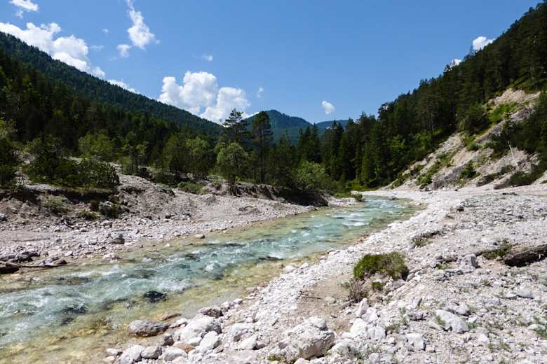 Man passiert die Kohleralm und kommt bald zum Lafatscher Niederleger. Nun geht es etwas steiler den Fahrweg entlang hinunter bis ins Hinterautal. Die Kastenalm ist an der markierten Weggabelung durch einen kurzen Abstecher zu erreichen. Von hier aus wandert man immer der Fahrstraße entlang talauswärts, vorbei am Isarursprung. Etwas ansteigend geht es hinauf auf die Gleirschhöhe (1.069 m) und anschließend wieder gemächlich absteigend vorbei am Gasthof Wiesenhof, bis man schließlich die Isarbrücke und in weiterer Folge Scharnitz erreicht. Nach kurzer Rast kann man sich im Naturpark-Infozentrum mit vollem Stempelpass sein wohlverdientes Goodybag abholen.
