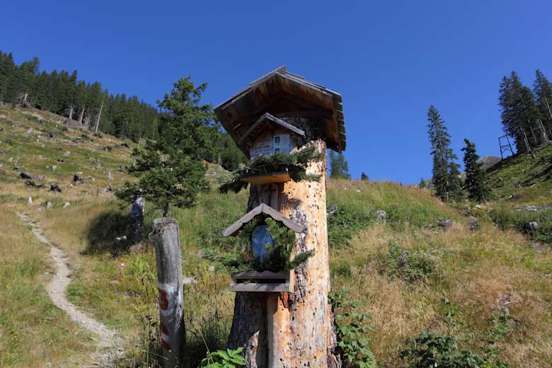 In Stockham befindet sich das Talmuseum und der Talwirt. Man folgt dem Weg hinauf zur Pertillkapelle und zweigt links auf den Wanderweg Nr. 50 ab. Dieser führt relativ steil durch den Moderegggraben hinauf zur schönen Modereggalm auf 1.720 m.