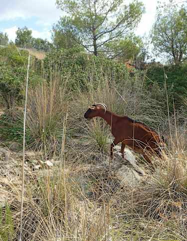 Hinter der Finca Ses Fontanelles führt der Pfad in östlicher Richtung durch schattigen Nadelwald. An einem breiteren Weg biegt man links ab und läuft nun Richtung Nordwesten steil bergauf zum Pas Gran. An der Steinpyramide wendet man sich nach rechts und folgt den Steinmännchen und roten Farbklecksen über ein Geröllfeld. Am Planes d'en Cabrit ist die schlimmste Steigung geschafft, der Weg führt nun flacher durch die offene Landschaft auf den Mola de s'Escalop zu.