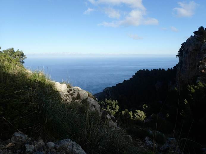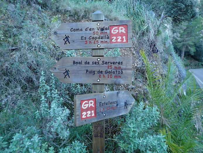 An dieser Kreuzung führt der GR221 links auf der Piste hinab zur Ma-10, folgt dieser für knapp 400 m nach links, bevor er rechts auf einem Pfad in Serpentinen bergab führt. Der Pfad trifft auf einen alten Küstenweg, der rechts zum Coll des Pi führt. Dort folgt man der Ma-10 erneut für etwa 300 m, bevor die alte Küstenstraße links weg führt und den Wanderer ins Etappenziel in Estellencs bringt.