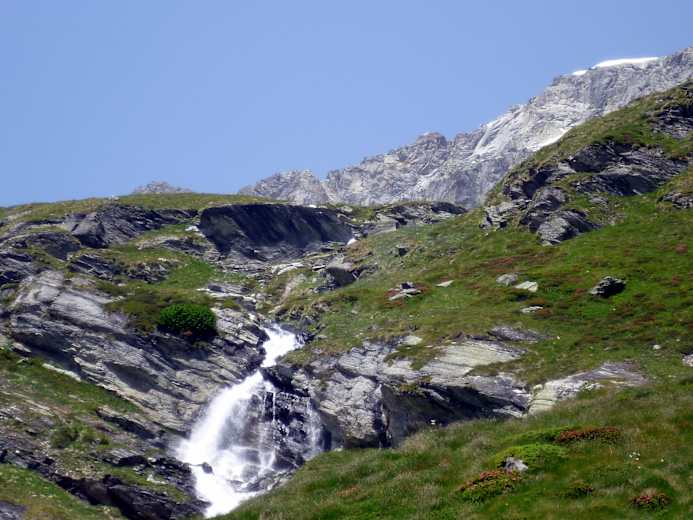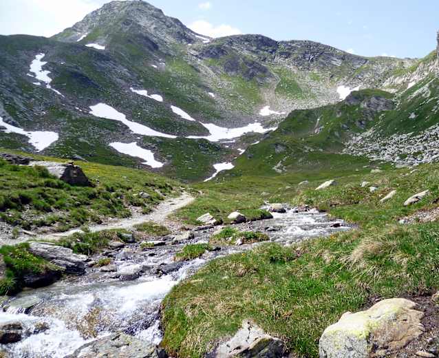 Nach zwei Bachquerungen und weiter ansteigend Richtung Norden trifft der Steig dann auf die Via Engiadina (1.944 m). Bei der Abzweigung hält man sich links aufwärts und stösst bald darauf auf den noch jungen Inn. Diesem folgt man in vielen Serpentinen aufwärts. Über ein Plateau geht es weiter zur letzten Steilstufe bevor man den glasklaren Lunghinsee (2.484 m) erreicht. Hier empfiehlt sich eine kurze Rast, bereits mit Aussicht auf den nahen Gipfel des Piz Lunghin.