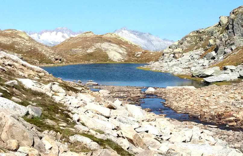 Der kurze Aufstieg zum Maighelspass ist bald geschafft – hier eröffnet sich eine superbe Aussicht auf den Pizzo Centrale und den Gemsstock. Eine Rast lohnt sich dort wegen des malerischen Portgerensees und der vielen Murmeltiere.