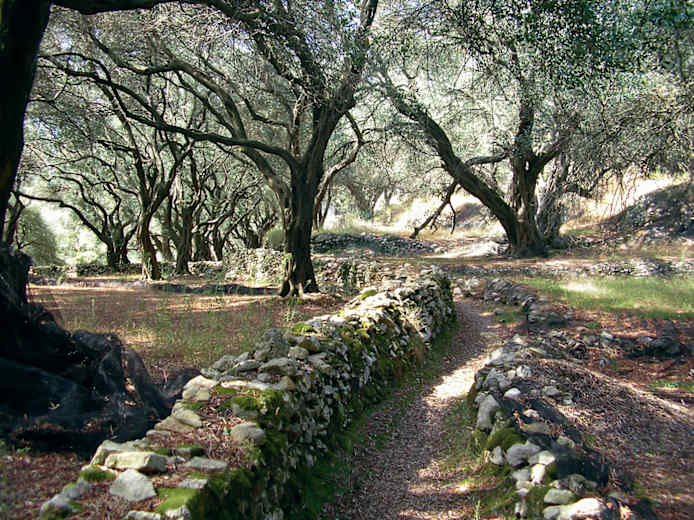 Man verlässt Lákones und erreicht etwas außerhalb einen Bella Vista, 260 m, genannten Aussichtsplatz mit einigen Souvenirläden und Restaurants, der eine traumhafte Sicht auf die unter einem liegenden Buchten bietet. Man geht 15 Min. auf der kurvigen Höhenstraße weiter und passiert ein Kloster. Danach folgt ein längeres gerades Stück. Hier achtet man auf die gelben Markierungen des Corfu Trail und verlässt die Straße kurz hinter einer kleinen Brücke. Ein Schotterweg führt nach links durch Olivenhaine zu einem ausgetrockneten Bachbett hinab. Dem folgt man ca. 20 m nach links, dann wendet man sich nach rechts auf einen Pfad durch terrassierte Olivenhaine. Nach ca. 50 m verbreitert er sich zu einem Feldweg und steigt sanft an. Wo er in einer Linkskurve die Anhöhe fast erreicht, achtet man auf einen rechts abbiegenden Pfad, der zwischen alten, sehr gepflegten Olivenbäumen an den südlichen Ortseingang von Kríni, 250 m, führt.