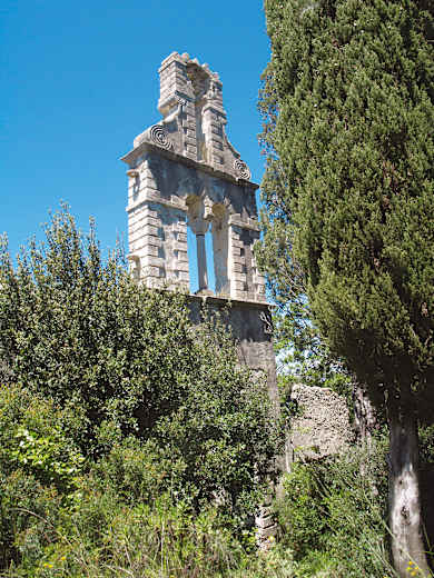 Ab und zu eröffnen sich Blicke auf die Steilklippen der Südspitze Korfus. Allmählich biegt der Weg in westliche Richtung ab und erreicht nach insgesamt 45 Min. die einsam gelegene Ruine des Muttergottesklosters von Arkoudíla, 100 m. Die 300 Jahre alten Gemäuer sind bereits ziemlich zerfallen. Der Klosterhof wurde längst von der Natur zurückerobert. Von einer Besichtigung ist wegen der Einsturzgefahr abzuraten; von außen präsentiert sich einem jedoch eine romantische Anlage.