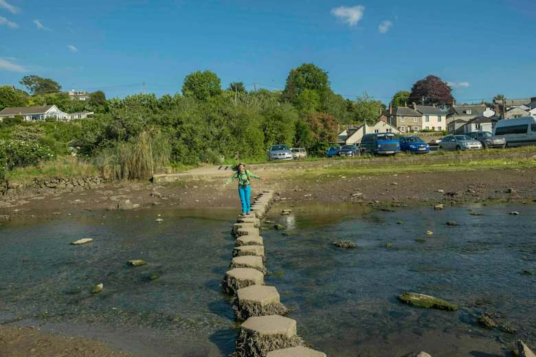 In Lerryn überquert man bei wenig Wasser den River Lerryn. Steine helfen bei der Überquerung. Bei Hochwasser geht man zurück zur Steinbrücke und folgt der ersten Straße nach links, bis man wenig später auf eine weitere Straße trifft, die zum Ufer des Flusses führt.