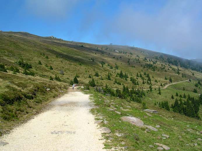 Vom Parkplatz auf der Weinebene orientiert man sich nach Süden. Man folgt dem Weg Nr. 20, der hier identisch ist mit der Via Alpina - Violetter Weg, dem E6 und dem 05, dem Nord-Süd-Weitwanderweg. Daran kann man schon ablesen, welche Bedeutung die Wege über diesen Grenzkamm haben und wie wichtig die Schutzhütten sind.