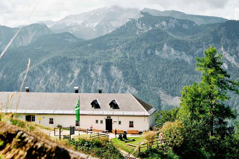 Noch einmal quert man einen Forstweg und folgt dem Steig 614 weiter aufwärts bis zur Hofalmhütte auf 1.305 m. Die Hütte steht auf einer schönen Lichtung am Fuße des Großen Pyhrgas und bietet einen wunderbaren Blick ins Ennstal.