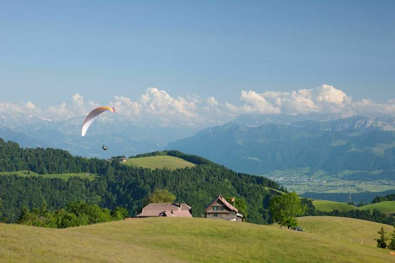 Der Abstieg führt vorbei am Gasthaus Alp Scheidegg, dem höchstgelenen Gasthaus des Kanton Zürichs. Von hier bietet sich ein atemberaubendes Panorama, bei klarer Sicht kann man bis zu den Berner Alpen sehen. Zusätzlich bescheren die von der Alp Scheidegg startenden Gleitschirmflieger, ein unterhaltsames Schauspiel.