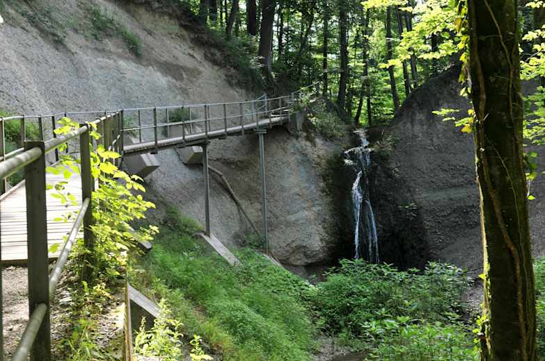 Die Route führt durch das ruhige, schattige Tobel, am Mühlenweiher und einer Kneippanlage vorbei, über zahlreiche Stufen und kleine Brücken bis zur Guhwilmühle. Die 1910 still gelegte Mühle beherbergt nun ein Restaurant. Der prächtige Riegelbau vereint die Eleganz der Belle Epoque mit dem rustikalen Charme eines Bauernhauses und kreiert auf diese Weise ein ganz besonderes Ambiente.