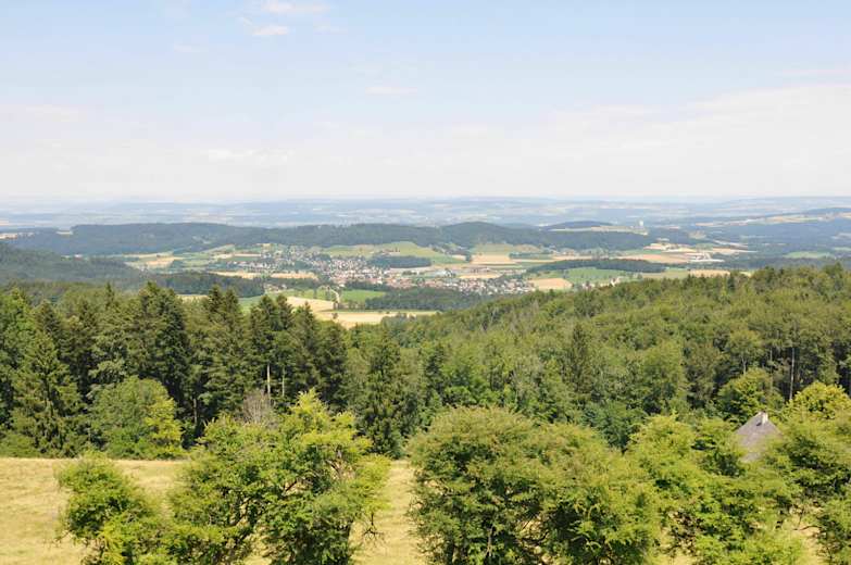 Nachdem man die Mühle verlassen hat, beginnt der Weg anzusteigen. Die Route führt nun über Wald und Wiesen über Scheunberg (Schümberg) auf den Schauenberg. Hier lädt eine Feuerstelle sowie der traumhafte Ausblick auf die Alpen und die ehemalige Vulkanregion Hegau zum Verweilen ein. Ein paar Mauerreste und eine Infotafel erläutern die historische Bedeutung der einstigen Burg.