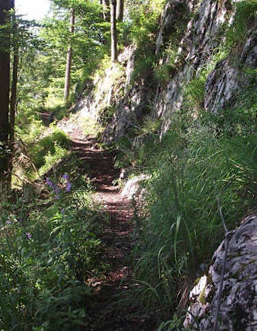 Steil steigt man in Serpentinen ab und im Wald hat man noch eine felsige Steilstufe zu überwinden. Schließlich gelangt man zum Aurach-Ursprung und kurz danach auf einen breitere Weg, der nun weniger steil hinunter zum Taferlklausee führt.