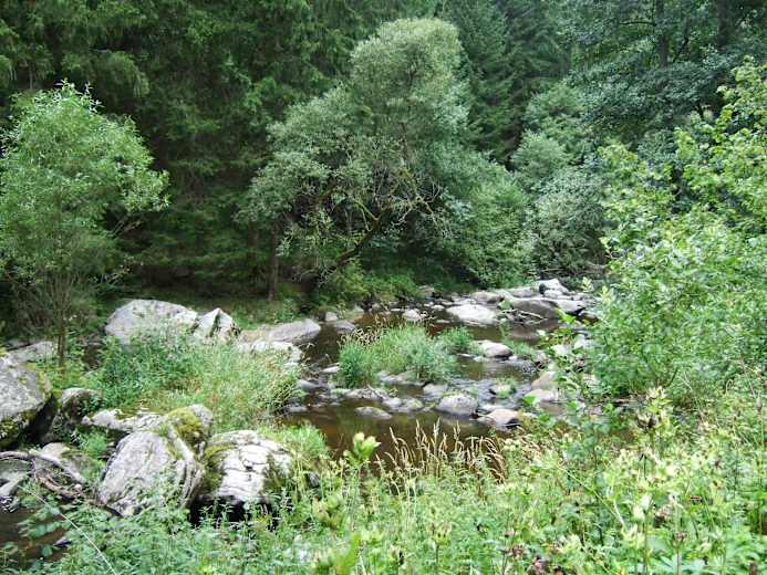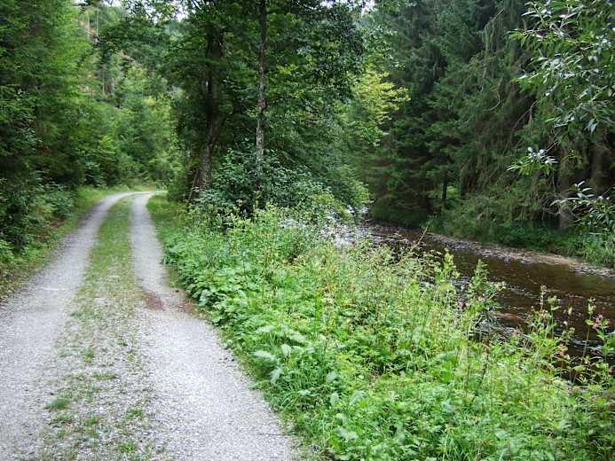 Nach der Brücke macht der Weg eine Rechtskurve und führt gleich danach in einer Linkskurve in den Wald hinein (rechts zweigt ein Weg zum Brunnenschutzgebiet ab). Vorbei an der Abzweigung des Naturfreundeweges Nr. 3 und mehreren Bänken wandert man durch den Wald und gelangt bald zum Ufer des Kamp. Kurz darauf erreicht man den Rastplatz Kaiserbüste.